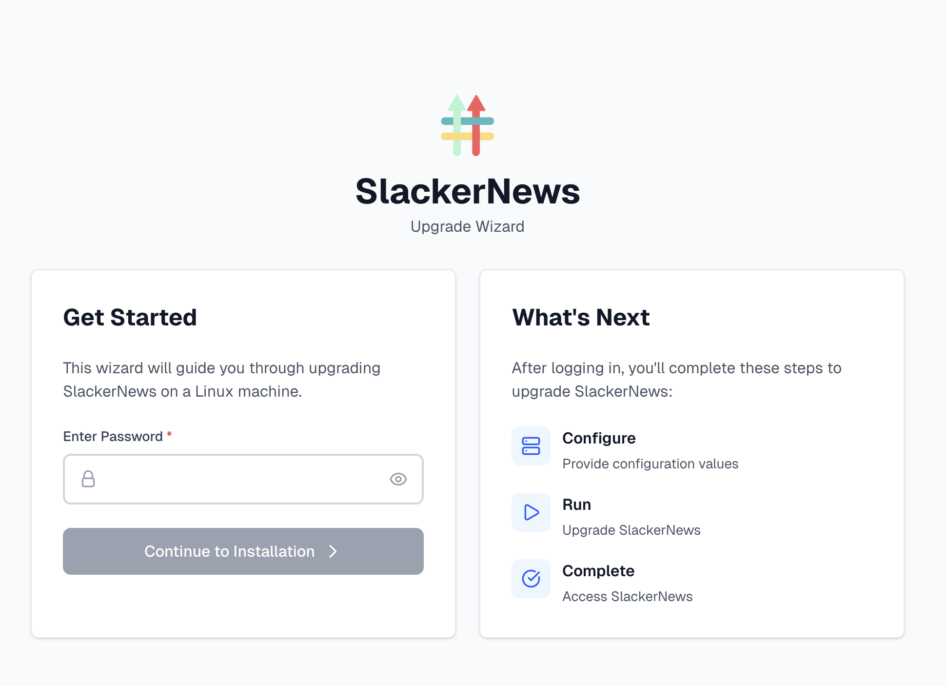 Log in to the upgrade wizard using the existing password for the Admin Console.