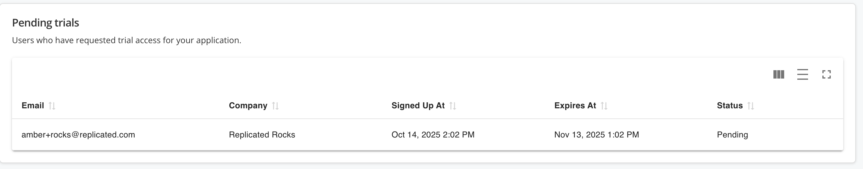 Under Pending Trials, review details about any pending self-service sign-ups, including the user's email address, company, sign-up date and time, and more.