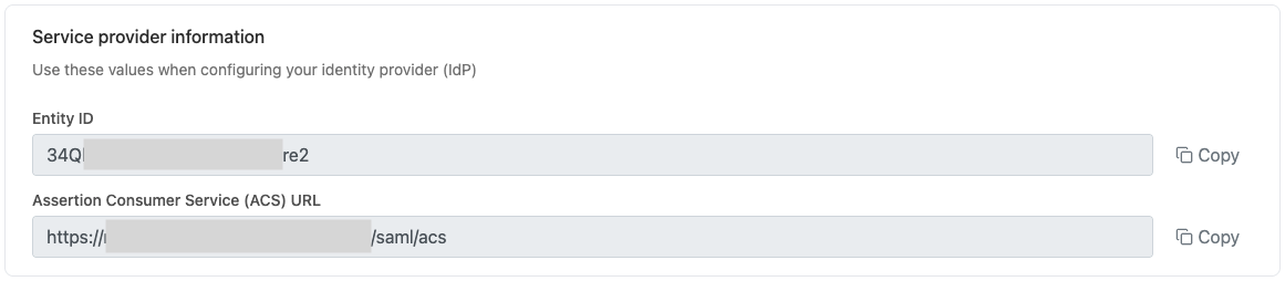 For Service provider information, copy the values provided and use them to configure your identity provider (IdP).