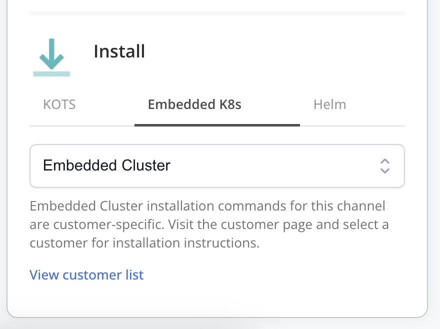 noteThe Embedded Cluster installation instructions are customer-specific. Click View customer list to navigate to the page for the target customer. For more information, see Get Customer-Specific Installation Instructions for Helm or Embedded Cluster below.