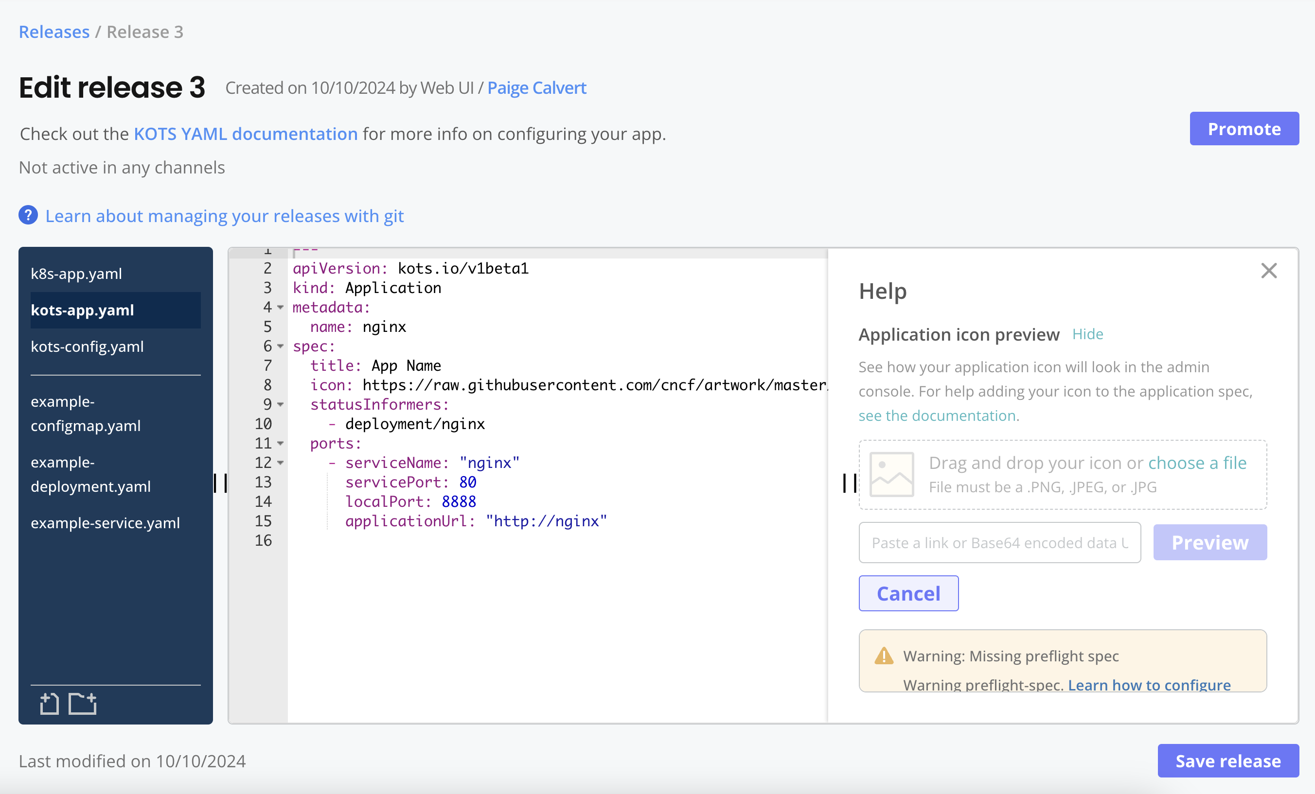 5. Create and promote a new release with your changes. For more information, see Manage Releases with the Vendor Portal or Managing Releases with the CLI.